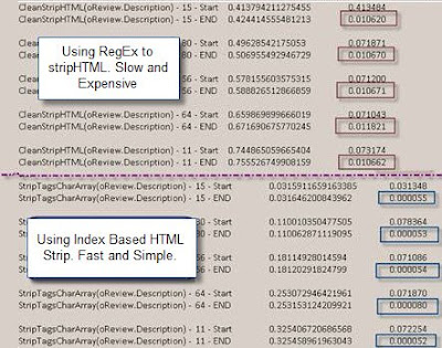 Since I work on a extremely user driven content web site, I have to make sure that there is no user inputted HTML on the page that break the CSS or the layout of the page. So we had to build a HTML Stripping functionality to strip out the HTML on the fly. We had initially used the obvious RegEx technique to strip out the HTML. But as the traffic increased the page performance/page load time started increasing. So we decided to enable trace on the page to determine the most expensive operation. So while re factoring the code we realized that the HTML stripping functionality was adding on the page load time.