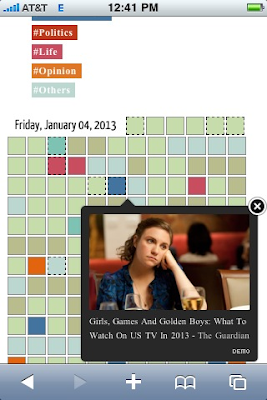 61Degree has a very simple UI interface where news articles are categorized into sections (news/sports/entertainment etc) and displayed as block with distinguishable colors. On a desktop you can just scroll over the blocks and an article title and image associated with it appears but on mobile (ipad/iphone/tablets) an extra area for double tapping is provided where the user can double tap and move from one article to next. Why double tap? On mobile devices, the blocks are quite small for large fingers so double tapping effectively provides the fat finger users to scan articles.